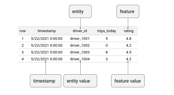 Below is an example data source with a single entity column (driver) and two feature columns (trips_today, and rating).