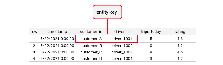 driver = Entity(name='driver', join_keys=['driver_id'])The entity name is used to uniquely identify the entity (for example to show in the experimental Web UI). The join key is used to identify the physical primary key on which feature values should be joined together to be retrieved during feature retrieval.