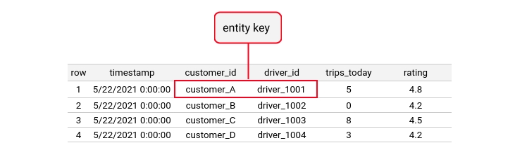 The entity name is used to uniquely identify the entity (for example to show in the experimental Web UI). The join key is used to identify the physical primary key on which feature values should be joined together to be retrieved during feature retrieval.