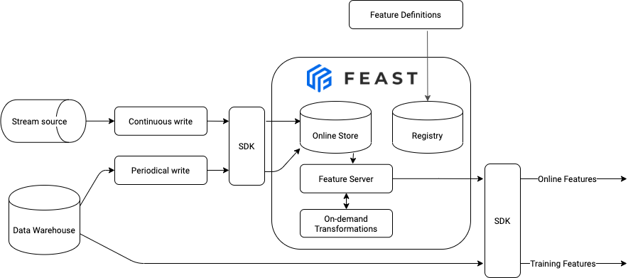 This approach is the most convenient to keep your infrastructure as minimalistic as possible and avoid deploying extra services. The Feast Python SDK will connect directly to the online store (Redis, Datastore, etc), pull the feature data, and run transformations locally (if required). The obvious drawback is that your service must be written in Python to use the Feast Python SDK. A benefit of using a Python stack is that you can enjoy production-grade services with integrations with many existing data science tools.