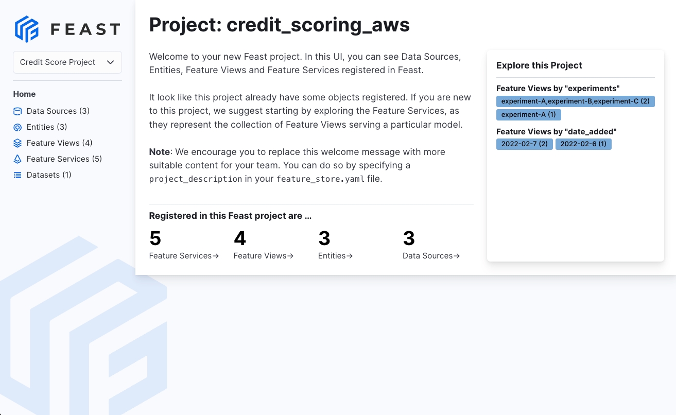 The advantage of importing Feast UI as a module is in the ease of customization. The <FeastUI> component exposes a feastUIConfigs prop thorough which you can customize the UI. Currently it supports a few parameters.