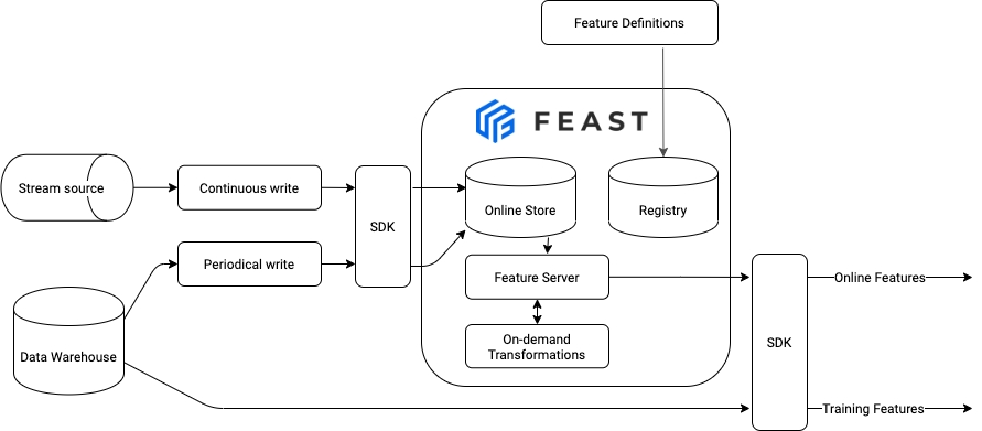 For example, you might not have a stream source and, thus, no need to write features in real-time to an online store. Or you might not need to retrieve online features. Feast also often provides multiple options to achieve the same goal. We discuss tradeoffs below.